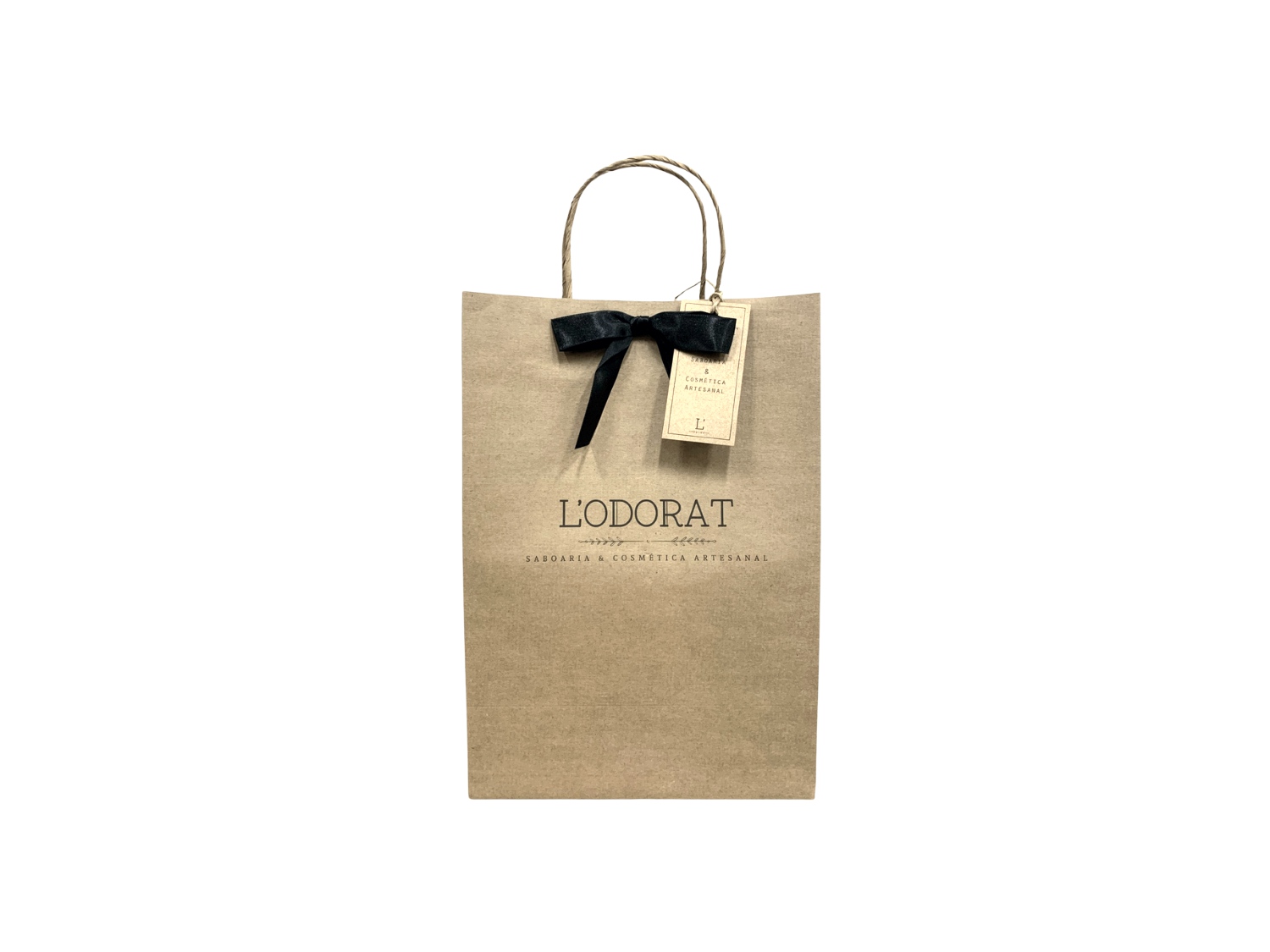 Fabricada em papel kraft resistente, conta com alças de papel retorcido, laço de cetim e tag L’Odorat, sendo perfeita para presentear em datas especiais, ações corporativas ou para quem deseja um acabamento bonito e funcional.